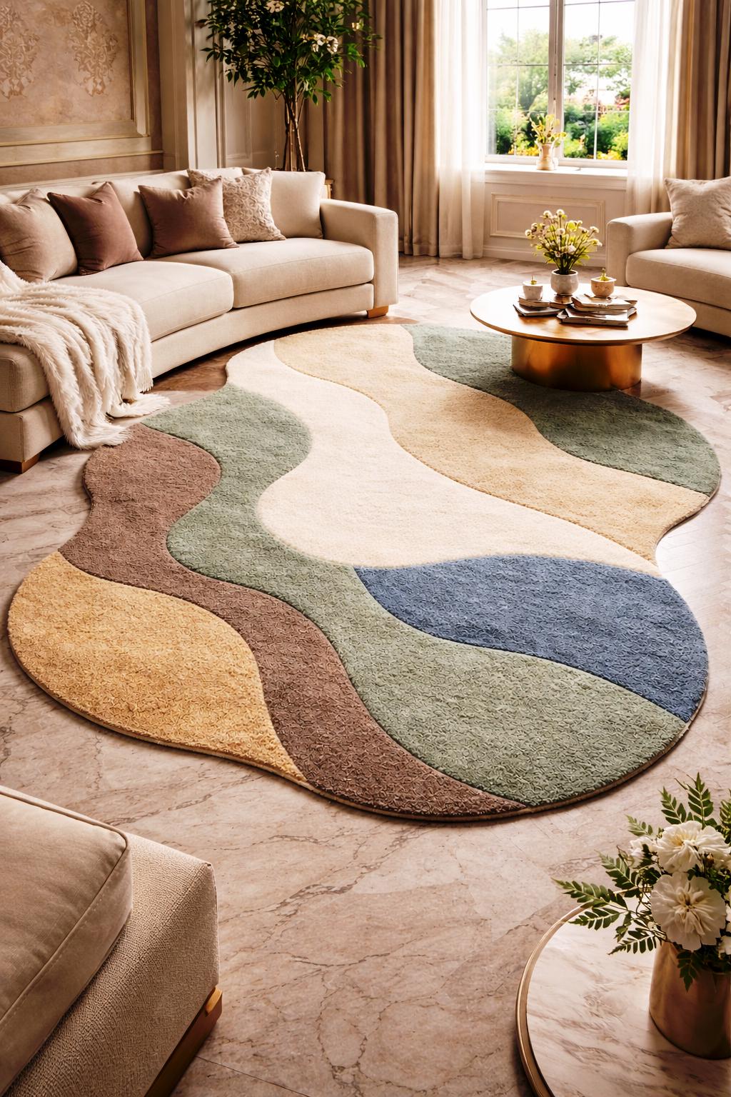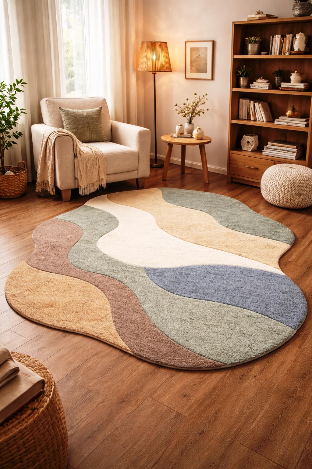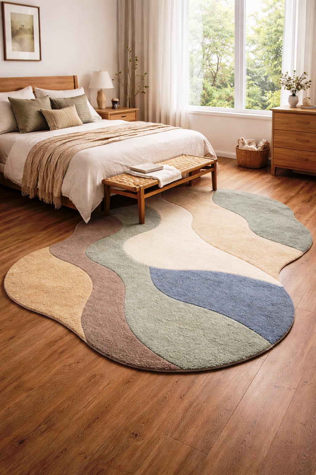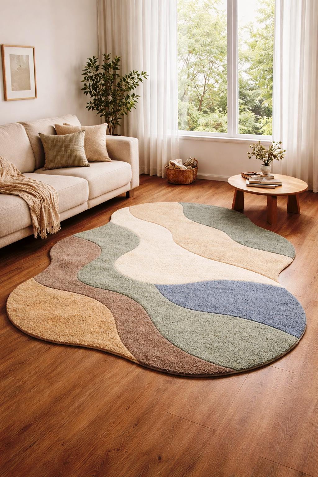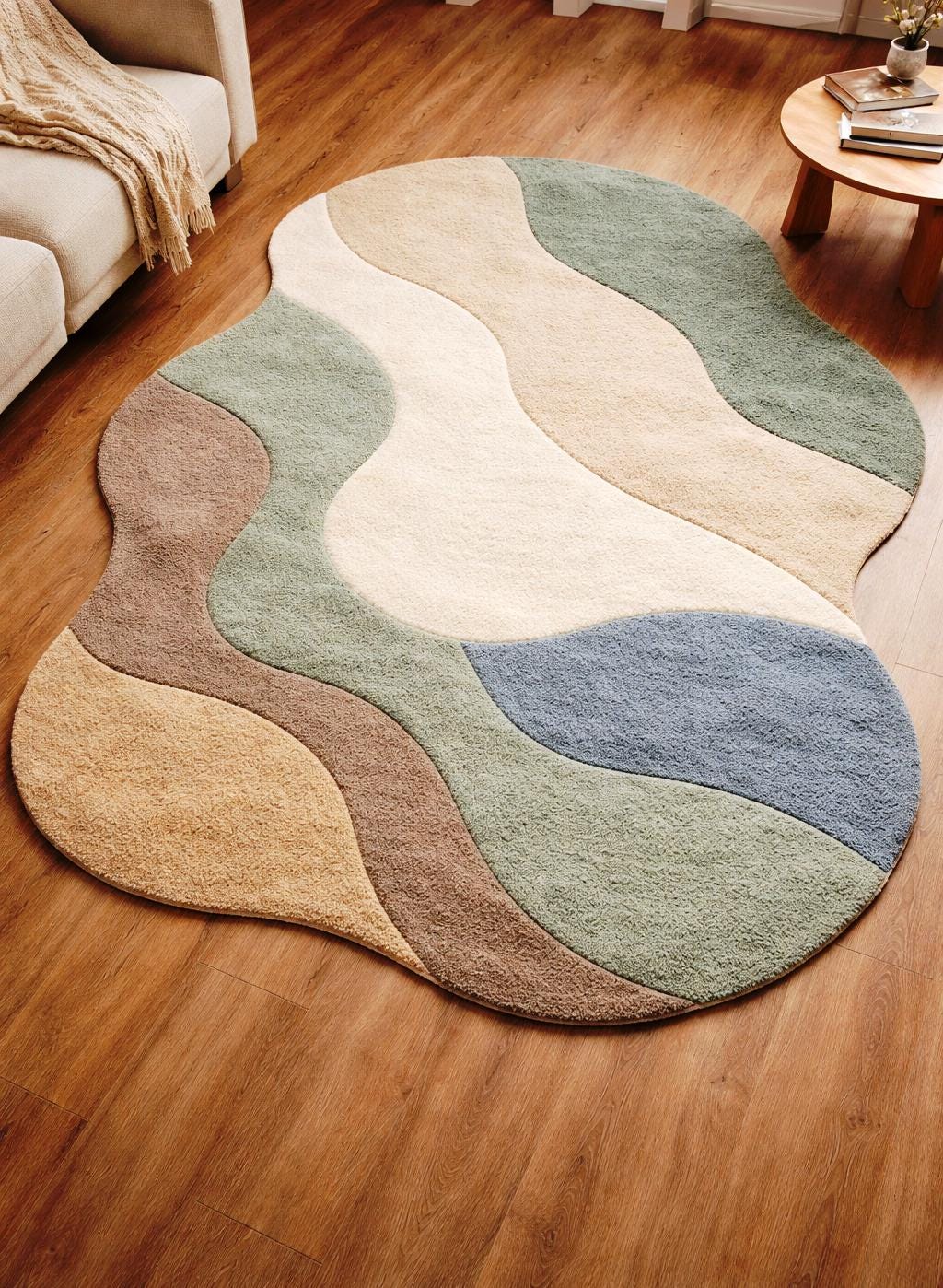 Add a touch of modern elegance to your home with this irregular shape handmade tufted rug, designed to bring warmth, texture, and artistic style into any space. Featuring soft organic curves and a calming palette of earthy tones like beige, green, brown, and muted blue, this rug is perfect for creating a cozy and stylish atmosphere.
