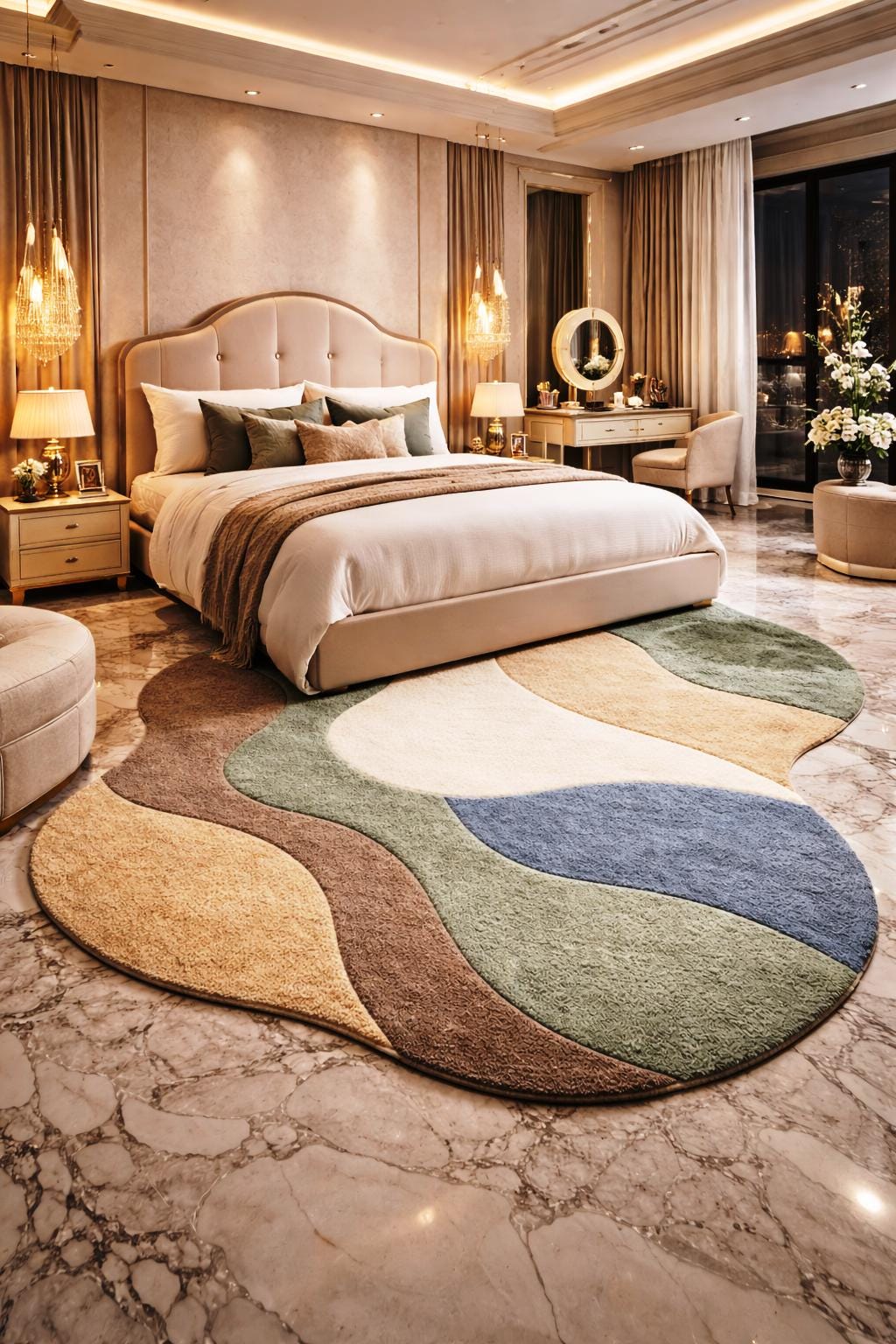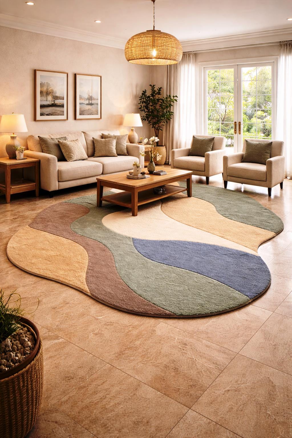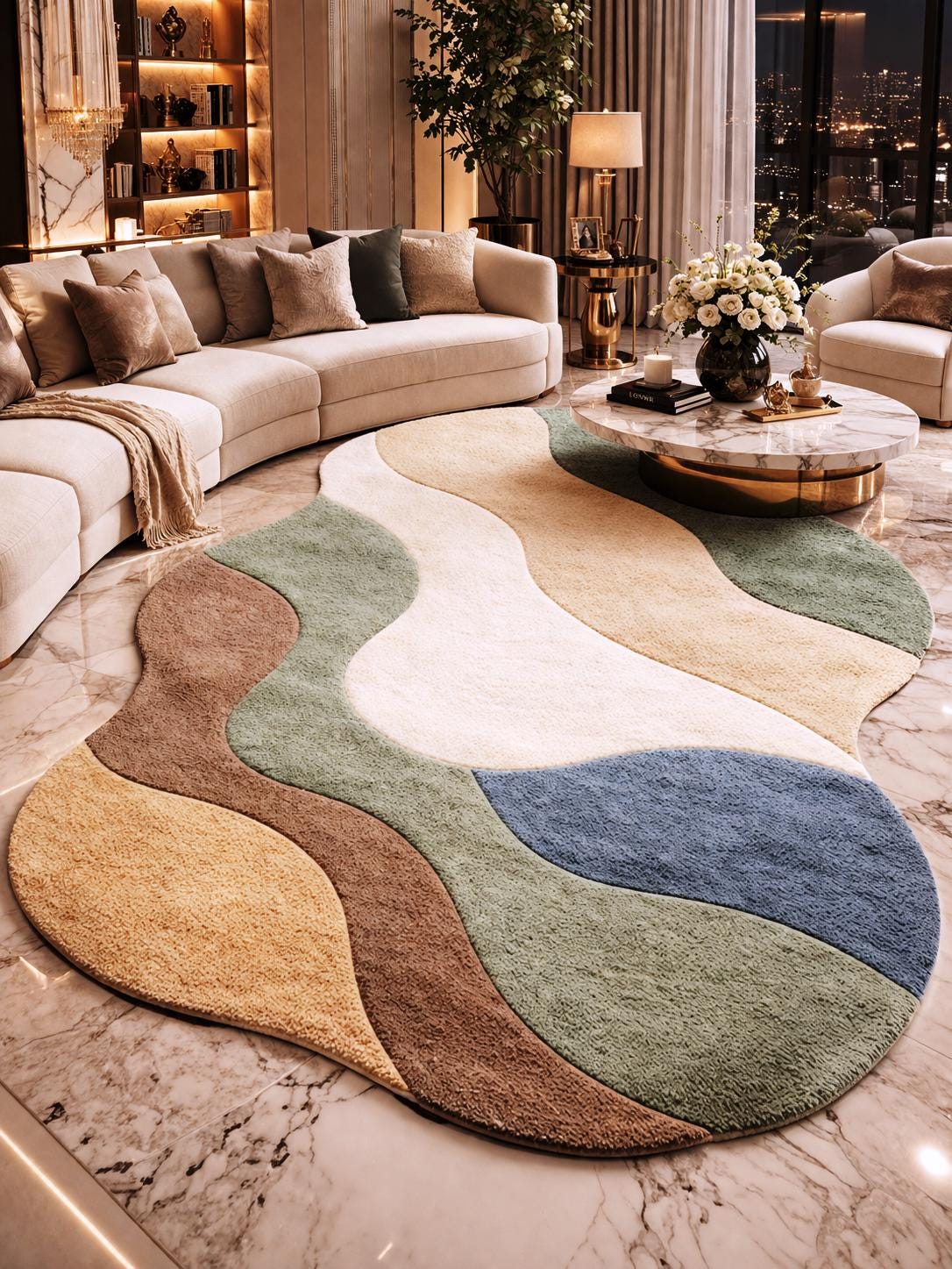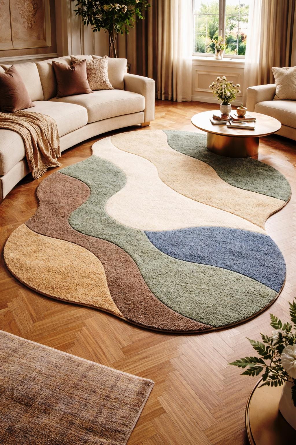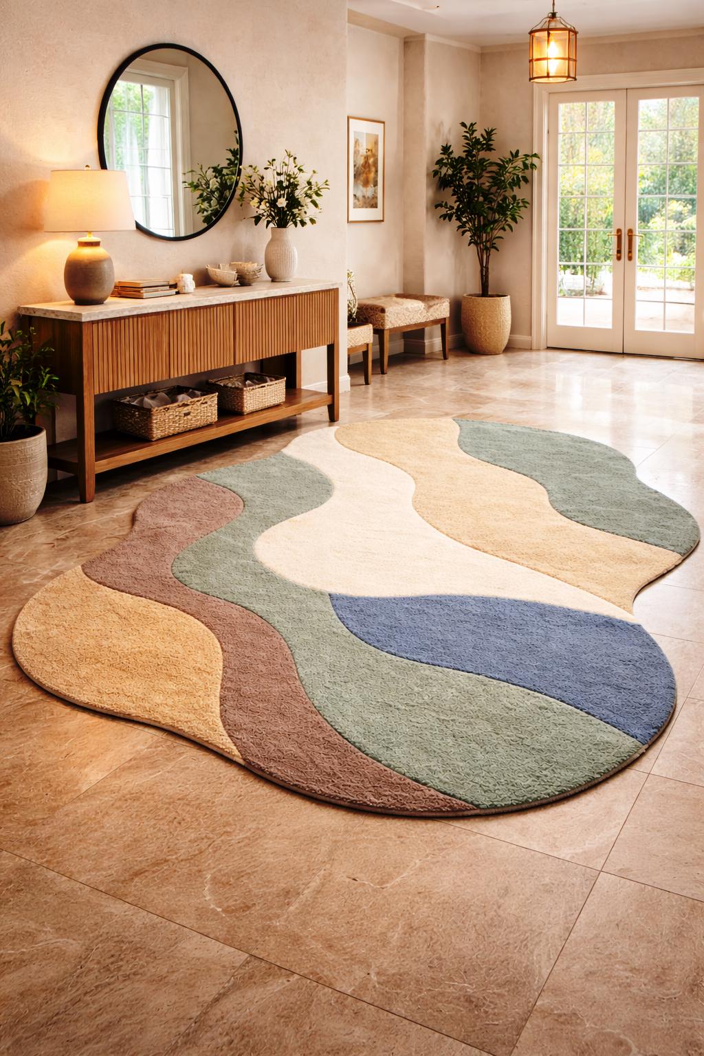 Add a touch of modern elegance to your home with this irregular shape handmade tufted rug, designed to bring warmth, texture, and artistic style into any space. Featuring soft organic curves and a calming palette of earthy tones like beige, green, brown, and muted blue, this rug is perfect for creating a cozy and stylish atmosphere.