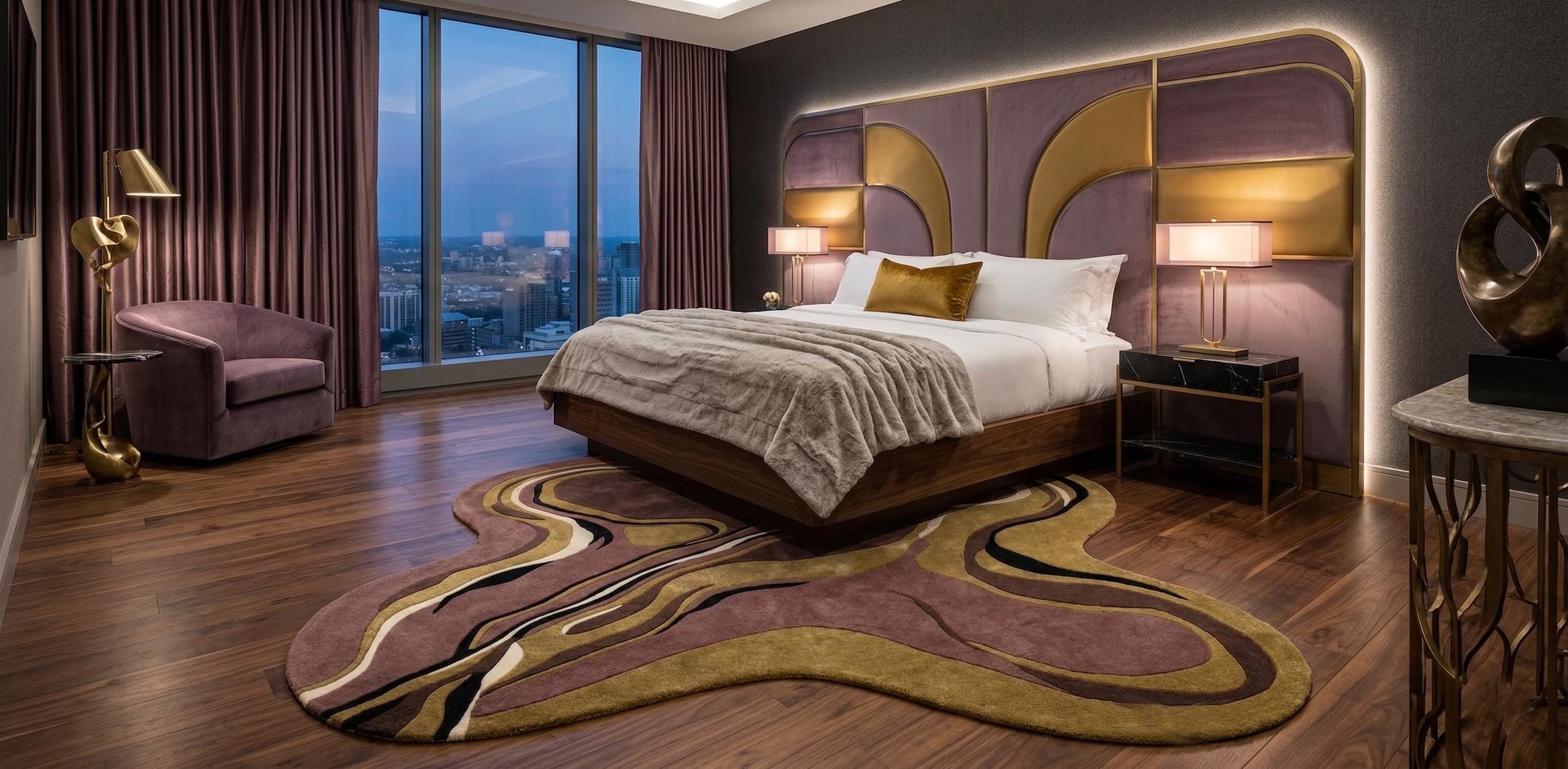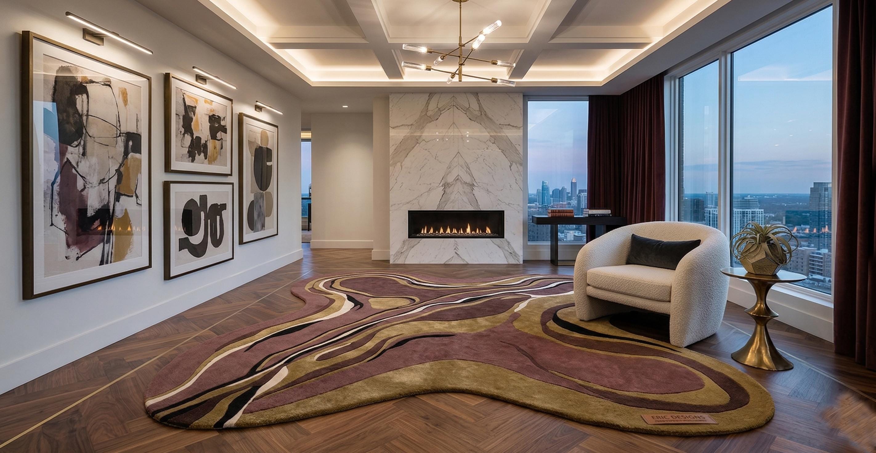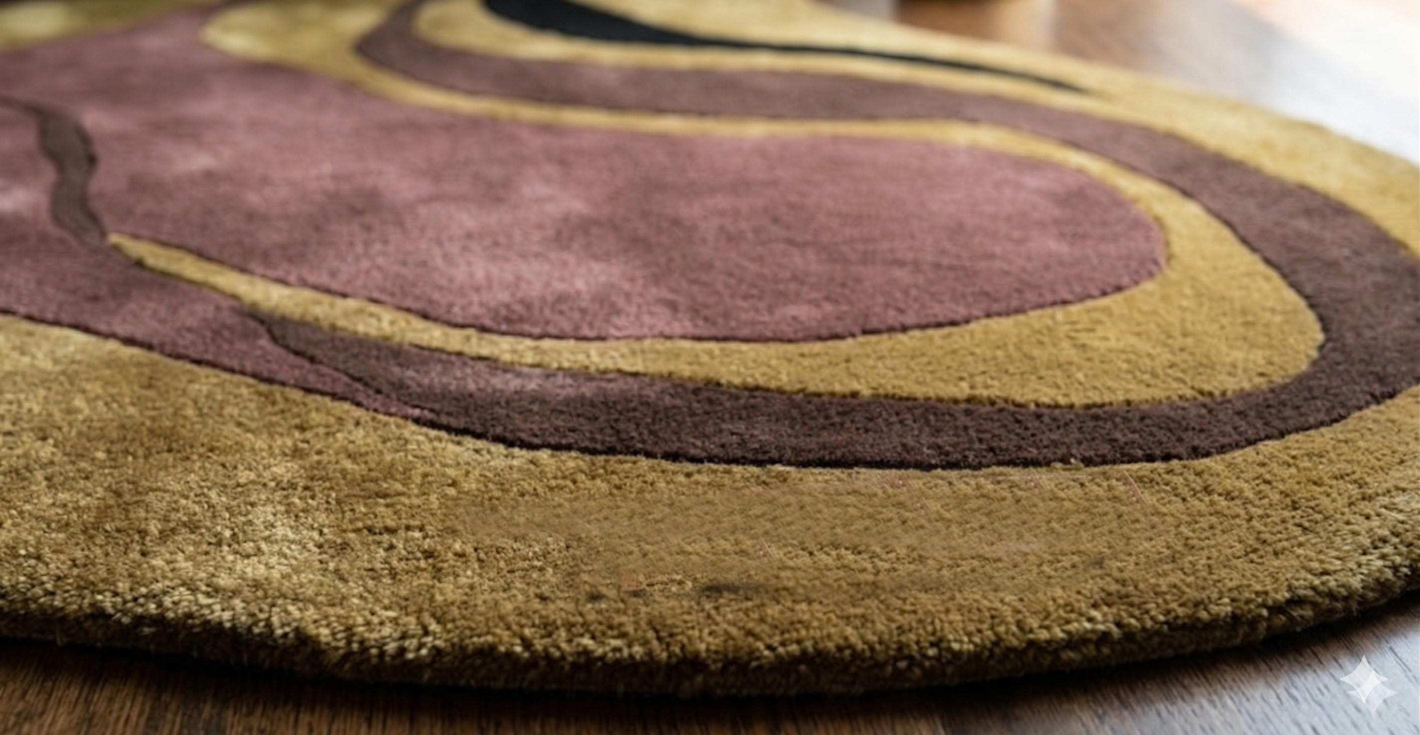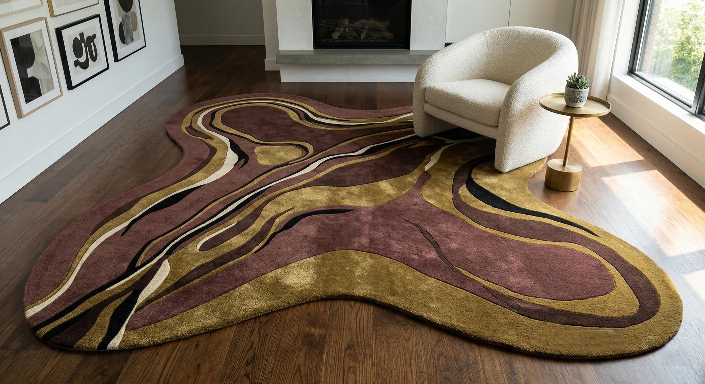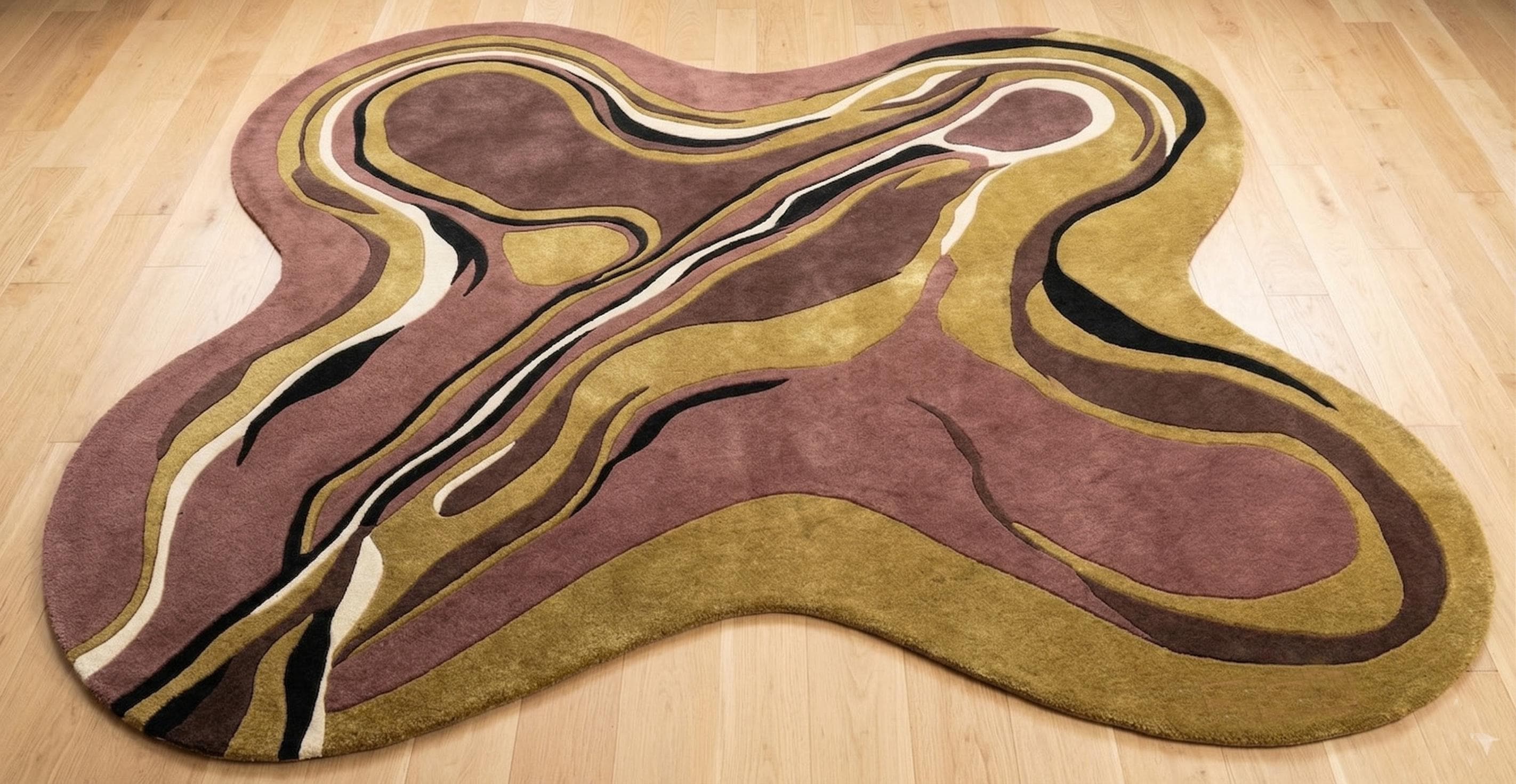 Transform your space with this stunning hand-tufted wool rug featuring a unique irregular organic shape and flowing abstract design. Inspired by modern art, this rug blends warm tones of dusty pink, gold, beige, and black, creating a luxurious centerpiece for any room.