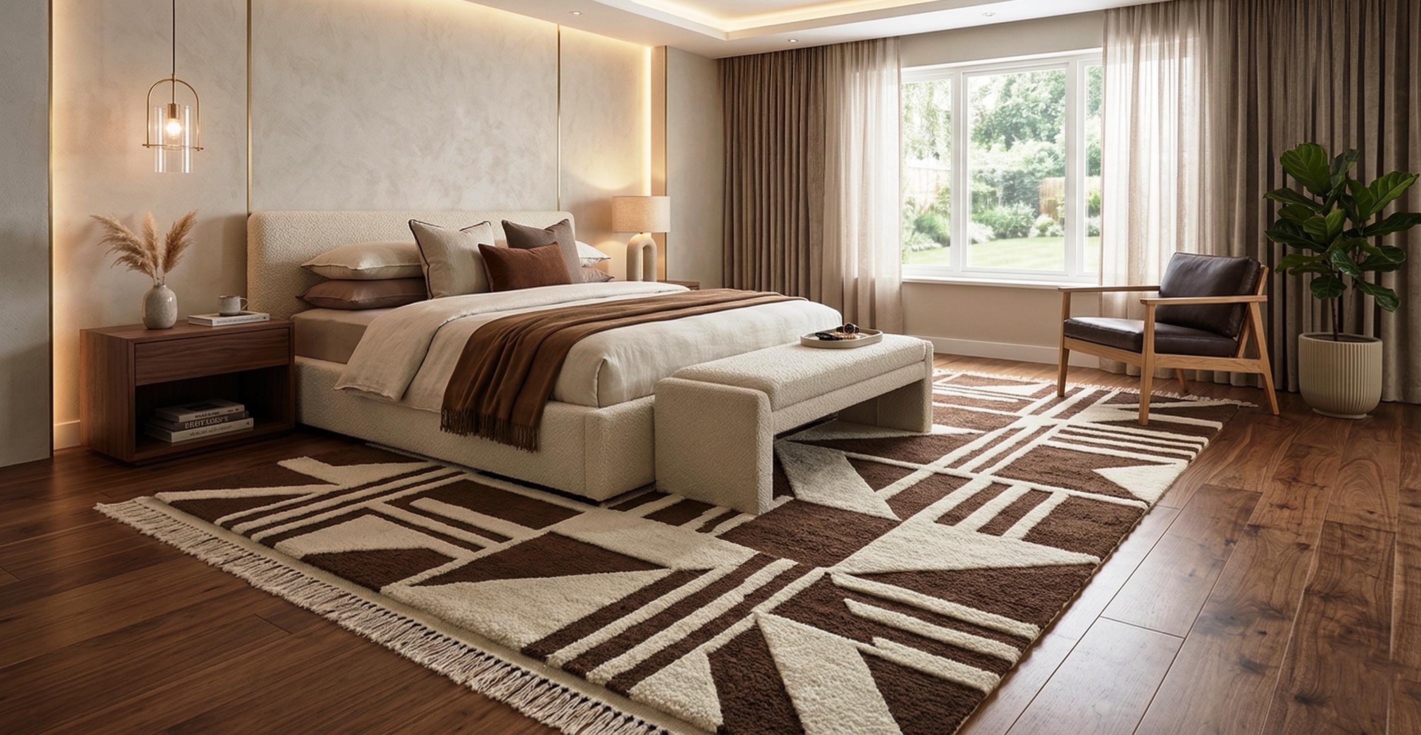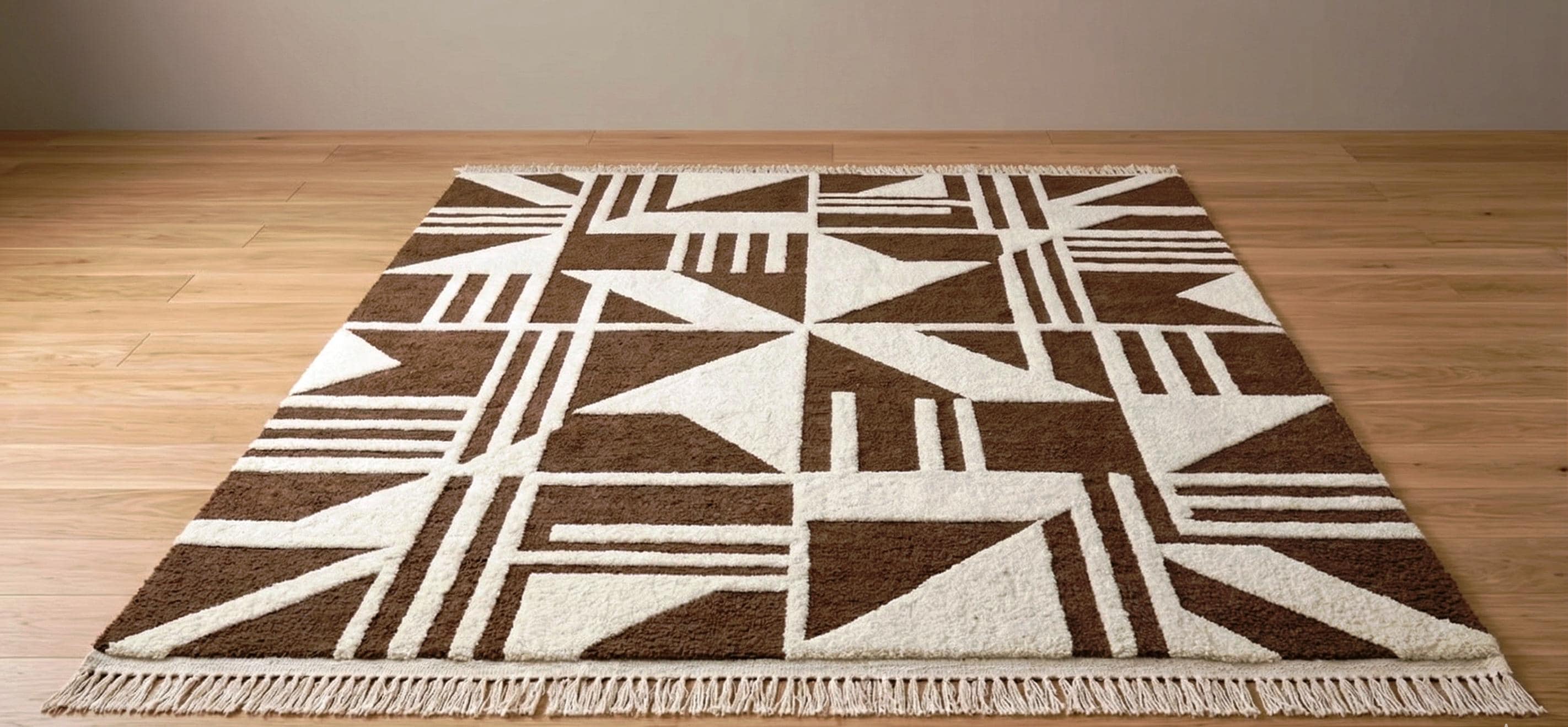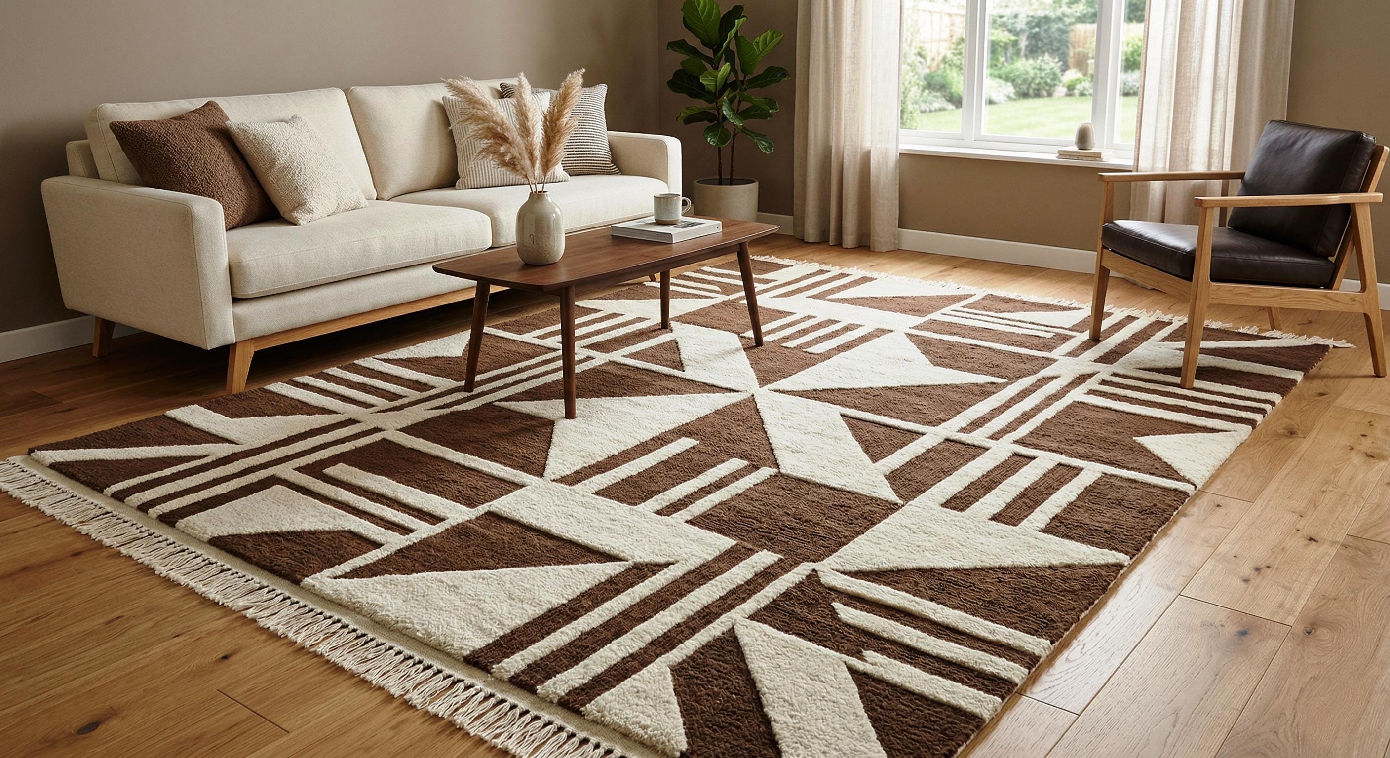 Bring warmth and contemporary style into your home with this beautifully handcrafted geometric brown and cream rug. Designed with bold abstract patterns and clean lines, this rug is perfect for modern, minimalist, and Scandinavian interiors.